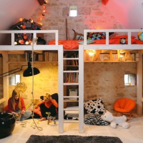 Bunk bed built for kids in attic of homeKids enjoy having unique areas to play in or even a small area to call “home”. A modified bunk bed custom-built in the attic/loft of this contemporary home would be the envy of any child, while still serving a functional secondary purpose via storage space for books, games, and other items. |